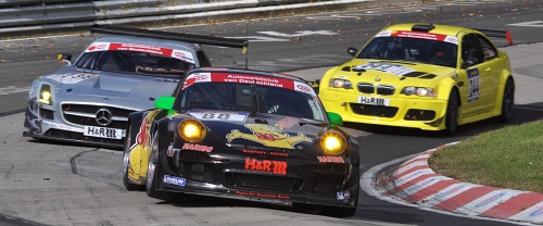 Erfolgreich – aber nicht ohne Macken: So lässt sich das Renndebüt des AMG Mercedes SLS GT3, pilotiert von Bernd Schneider und Thomas Jäger, zusammenfassen. Von Startplatz drei gestartet übernahm Bernd Schneider beim Start den zweiten Platz hinter Christian Hohenadel in der #86 Corvette, bevor es eingangs Mercedes-Arena zur Kollision der beiden Führenden kommt. Hohenadel und Schneider drehen sich, Frank Stippler (Audi R8) kann nicht mehr ausweichen und trifft den nagelneuen Rennflügeltürer.